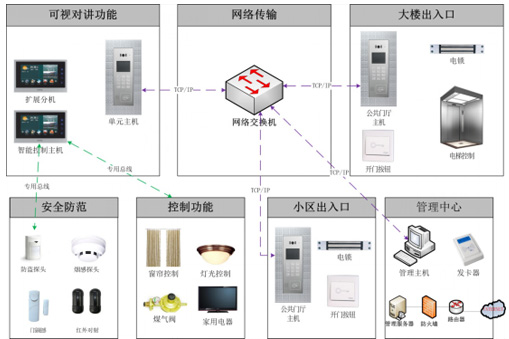 公司可為客戶提供可視對講系統(tǒng)、閉路電視監(jiān)控系統(tǒng)、門禁管理及消費(fèi)一卡通系統(tǒng)、停車場監(jiān)控系統(tǒng)、周界防盜報警系統(tǒng)、電子巡更系統(tǒng)、弱電配套保障系統(tǒng)等建筑智能化系統(tǒng)的解決方案。以公司提供的可視對講系統(tǒng)為例??梢晫χv系統(tǒng)是一種針對工程商與現(xiàn)代物業(yè)要求設(shè)計的保安系統(tǒng),以管理中心為核心,以樓宇可視對講為主體,可與計算機(jī)系統(tǒng)相連接,實(shí)現(xiàn)呼叫、對講、監(jiān)視、開鎖、聯(lián)網(wǎng)、文字/圖片信息發(fā)布、住戶/訪客留影留言、安防報警、戶戶對講、遠(yuǎn)程視頻監(jiān)控、廣告播放、電子相框、多媒體播放、電梯聯(lián)控、社區(qū)聯(lián)網(wǎng)服務(wù)等多種功能,達(dá)到物業(yè)綜合管理的最佳要求。具體結(jié)構(gòu)圖如下: